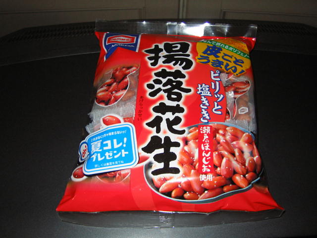 とまあ、ここまでが前置きで、これからが本題なんですけどね。本題のほうは何なのかというと、ピーナッツでございます。数少ないこの連載で、既に“ミックスナッツ”を取り上げているというのに、またしてもピーナッツなのか?…と思われるかも知れませんが、そうです。またしてもピーナッツです。そもそも事の発端はですね、うちの近くのスーパーで亀田製菓の “揚落花生” というのを発見したことにあるわけなんですが、何てカラダに悪そうな!…というのが第一印象でありました。ただでさえ食べ過ぎると下痢ピーになりそうなピーナッツだというのに、それを揚げてあるわけですからね。でも、何だか美味しそうだったので、買って帰って食べました。買って帰って食べてみた結果、それほど、揚げてあるなぁ。…という感じでもなかったんですけどね。落花生には外側の殻のほかに、マメの部分にも茶色い薄皮がついているわけなんですが、この “揚落花生” というのは皮かぶりの状態のまま揚げてあるのがポイントのようですね。何でもこの薄皮の部分に、カラダによいとされるポリフェノールがたくさん含まれているんだそうで。が、そんなことよりも僕は、パッケージにも書かれている “ピリッと塩きき” のほうに大いに心を動かされてしまいました。僕ってピーナッツに関しても塩味が濃いタイプのほうが好きなんですよね。で、この亀田の “揚落花生” は “瀬戸のほんじお” を使用しているそうで、パッケージの写真でも塩の粒が確認出来るくらいなんですよね。これはもう、相当にソルティなフレーバーが期待出来るのではなかろうかと思われるわけでありまして。