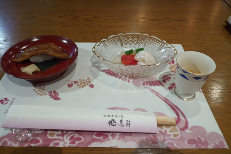 こんな感じ。 全種類が揃った右の写真のほうだけでよかった気もするんっすが、炭火は、既に焼かれている焼き魚を温める用途、ならびに油揚げを焼く用途で用意されてたことを知らしめるべく、網に何も乗せられてないバージョンのほうも掲載しました。 左のほうに見えている茶碗蒸しみたいなヤツは 枝豆豆腐 、右下に見えているお椀は 「茶粥です。」 との事だったんっすが、蓋を開けてみたら、ただの味噌汁じゃん…。 が、食べてみたら、普通に茶粥だったりして、いやあ、疑ったりして、申し訳なかったな…と。 これが出された時点で、 右のほうの味噌汁は、まだ出されていなかったんっすよね。 で、この茶粥が出されることで、奈良感が半端なく高まって、何よりでありましたが、最後にデザートの