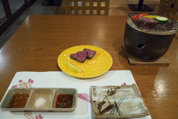 メインの “焜炉” 、キタぁぁぁぁぁぁ♪ A5ランク黒毛和牛炭火焼 添え野菜 っすな。 A5ランクなので、半分脂みたいな肉かと懸念していたら、全然そんなことはなく、じゃ、赤身で、ぜんぜん噛み切れないバージョンなのかと思ったら、そうでもなく、めっちゃ柔らかくて美味しくて、ヒレっぽい感じで、美味ぇぇぇぇぇぇぇ! 鱶鰭 (フカヒレ) なんかより、こっちのヒレのほうが美味ぇぇぇぇぇぇぇ! 本当にヒレなのかどうかは不明なんっすが、そんなことはどうでもよくて、美味ぇぇぇぇぇぇ! で、これ、確かに炭火焼きでありますな。 一見すると火力が弱そうで、焼けるのか? …と、心配になっちゃうんっすが、固形燃料なんかよりも、ぜんぜん早く焼けます。 網焼きなので、余計な脂が落ちるのもよくて、で、難点を言えば、もうちょっと “つけダレ” の量があると、よかったかな? …と。 ポン酢と岩塩、自家製ステーキソースの3種が用意されたんっすが、どれも量がお上品で…。 素材の味よりもタレ派なので、ちょっと物足らなかったんっすが、ま、素材が半端なく美味いので、ぜんぜん問題はなかったんっすけど。 で、ここまで来れば、後は惰性みたいなものなんっすが、