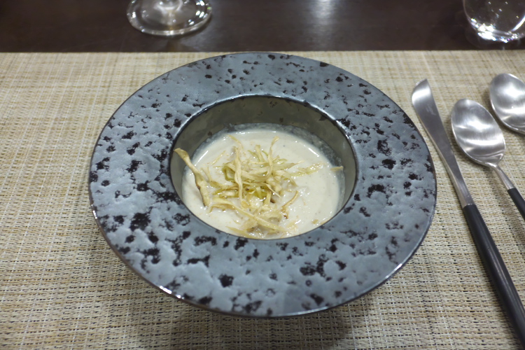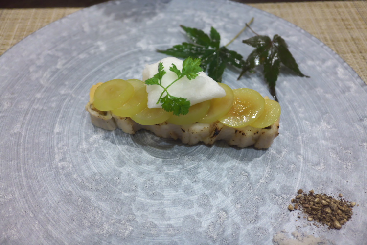 まずは、何か前菜っぽいの。 フレンチだと、何て言うんでしたっけ? イタリアンだと、アンティパスト? イタリアンなのにアンチ・パスタって、和食なのに「醤油、あかん」 って言ってるようなものなんっすが、アンティパストとアンチ・パスタは違うと思うし、で、フレンチだと、何て言うんでしたっけ? アントレとオードブル? 「アントレ」 だと何か、アンドレ・ザ・ジャイアントとか、「おんどれ」 みたいでガラが悪いので、普通にオードブルでいいかと思うんっすが、「ベルサイユのばら?」「それはアンドレだね。」 あ、そっちを連想する通りすがりのペンギンもいるんっすな。 アンドレ! オスカル! 『アントレ』(前菜)は『アミューズ』(一口のお愉しみ。お通しのようなもの。)に続く料理で、うんぬん。 そういえば、アミューズというのもありましたな。 今回、最初に出されたのが、アントレなのか、アミューズなのか、オードブルなのかは分からんのっすが、とりあえず中身のほうは 「三原産蛸の柔らか煮」「瀬戸内産秋鯖の低温調理と茄子のムース 生姜とレモンのコンフィチュール 〜梶谷農園のベビーリーフを添えて〜」「穴子とフォアグラのテリーヌ 竹原産の葡萄と竹鶴の日本酒を使ったジュレ」の3品っすかね? 言われてみれば左上のヤツは、何かタコの吸盤っぽいのがあるっぽいような、東京キューバンボーイズっぽいような? で、残りの2つは…、分からん。 で、続いては