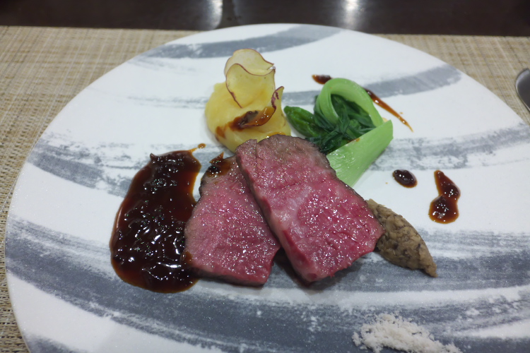今日のメイン、キタぁぁぁぁぁぁ! 「峠下牛ロース肉のグリエ 広島産舞茸と文田椎茸のデュクセル」 っすか。 峠下牛(とうげしたうし)じゃなく、峠下牛(たおしたぎゅう)って読むんっすよね。 これ 。 闘牛で 倒した牛(うし)は 峠下牛(たおしたぎゅう)。 そう、覚えておくといいと思います。 牛に演歌を聞かせて、本当にリラックスするのかどうかは疑問なんっすが、「ドナドナ」 のほうが、よくね? 可愛い子牛、売られてゆくよ〜、悲しそうな瞳で、見ているよ〜♪ ストレス・マックス! ま、最終的にグリエにされちゃうんだから、リラックスも糞もないんっすが、美味ぇ! めっちゃ美味ぇぇぇ! 牛サンには申し訳ないんっすが、美味いのが悪い! 食べられたくなかったら、もっと不味くなればよかったんや! で、牛さんは文句なしに美味かったんっすが、舞茸と椎茸、なくね? そう、思ってしまった人がいるなら、素人っす。 デュクセルっすぜ? そんな、目に見えてキノコなワケ、ないじゃん。 えーと、デュクセル 。 食用キノコ、タマネギまたはエシャロット、タイムやパセリ等のハーブ、黒胡椒を細かく刻んで混ぜ、バターでソテーしてペースト状に煮詰めたものである。 あ、やっぱ、ソースの部分っすよね。 多分、そうだと思ってました。 一瞬、このチンゲンサイみたいなのが、舞茸と椎茸? …と思ってしまったんっすが、やっぱ違うっすよね。 何はともあれ、車海老のローストで谷底に転落したテンションが、肉料理でV字回復して、何より。