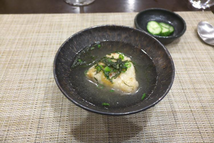 「梅と岡本醤油の麦味噌を使用した焼きおにぎり」。 フレンチなのに、意外。 が、これ、お茶漬けみたいになっていて、めっちゃ美味ちい♪ フレンチの重鎮の柔軟性が光る逸品でありましたが、でもって、