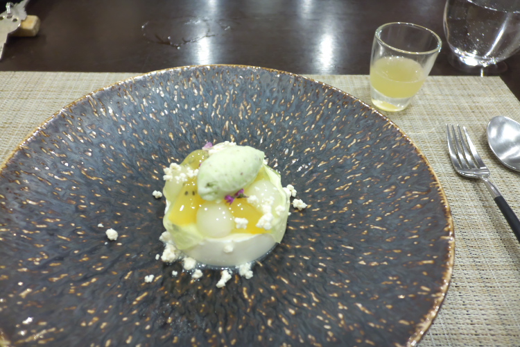 最後にデザート。 「竹原の酒造の酒粕ブランマンジェ キウイフルーツと共に」。 何か、共に民主党みたいで、いいっすな。
