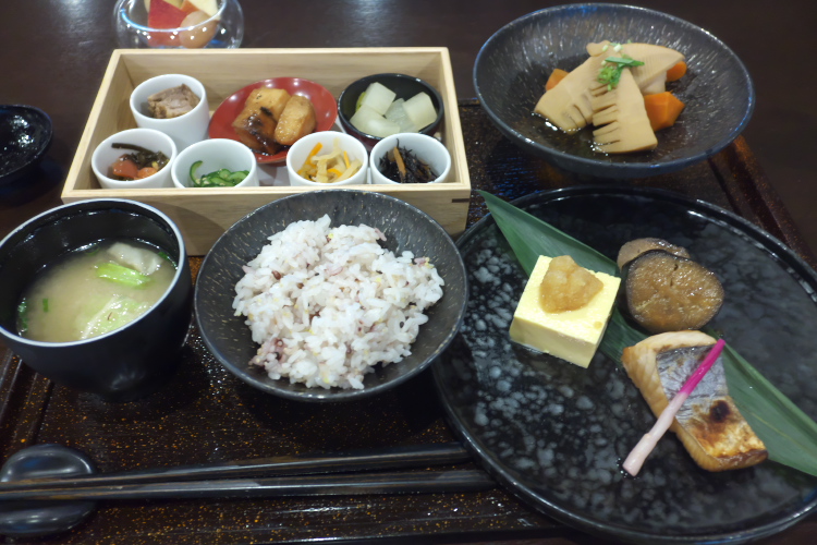 夕食と同じ、 “向かいの建物” っす。 バイキングではなく、和定食っす。 出てくるのがゆっくりなので、時間に追われていると、ちょっと焦ります。 あっちの席の人とか、こっちの席の人とか、まだ食べてないみたいなのに、後から来た僕のほうに先に持ってきてくれて、も…、もしかして、 “いちばん高い部屋の上客” だから、優遇された? 何か、気まずい…。 と思ったら、あっちの席の人も、こっちの席の人も、既に食べ終わって、ゆっくりしていただけっぽくて、安心しました。 で、中身のほうはというと、典型的な旅館の朝ご飯やな…と。
