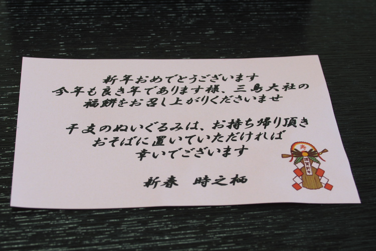 で、続いては「夕食の部」。 通常、風呂 → メシという流れになるんっすが、今回は夕食が17時開始っすからね。 前述の通り、今回の 「食べるところ」 は、こちら 。 旬膳処 茶目。ちゃめ? 変な名前なんっすが、それで合ってるみたいっす。 「泊まるところ」 から、歩いて5分くらい。 雨や雪が降ってたりすると、移動がちょっと面倒なんっすが、それはどのレストランを選んでも同じことかと。 今回、飯を食った後、そのままイルミネーションを見る予定なので、まったく問題なし。 空きがあれば一般人も利用可能なんっすが、この日は予約で一杯だった模様。 一般客は好きなものを頼めるみたいなんっすが、夕食付きプランの場合、「季節の移ろいを味わう創作和懐石」 を食べさせて頂けることになるのではなかろうかと。 奥のほうの半個室みたいな席に案内されて、まずは無料のお飲み物サービス。 いつもなのか、お正月スペシャルなのかは不明なんっすが、ワインか日本酒、好きなほうを選べます。 「時之栖」 は地ビールが有名なんっすが、それは選べません。 酒が駄目な人の場合、ソフトドリンクに変更して貰うことは可能かと。 で、ワインか日本酒、個人的にはどちらもあまり得意ではないんっすが、とりえあず赤ワインを貰いました。 で、本日の御献立は、こちら。