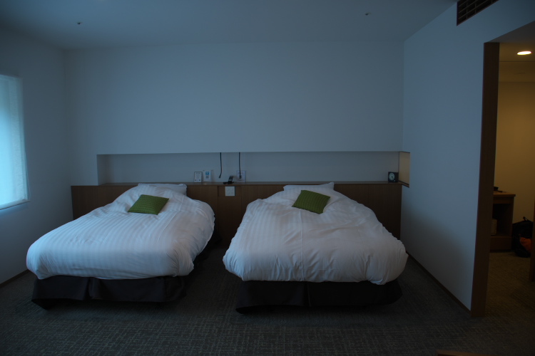 ということで、お部屋に到着。 「月の棟 ツイン」 っすな。 客室の詳細は こちら 。 緑ゆたかな自然に面した庭の棟、城崎温泉街に流れる大谿川に面した月の棟。 大きくその2つに別れるみたいなんっすが、月の棟のツインはコンフォート・ツインとユニバーサル・ツインの2種類。 僕が泊まったのはコンフォートのほうなんっすが、