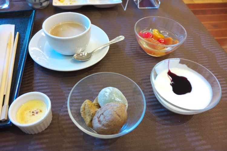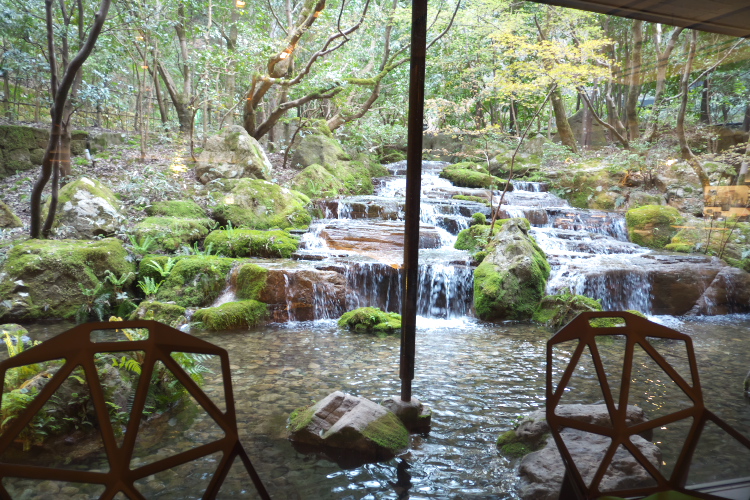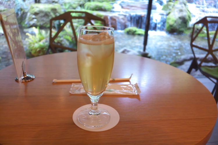 天然なのか、作り物なのかは知りませんが、ラウンジから見える渓流みたいなのが凄ぇぇぇぇ! で、ウェルカムドリンクは生ビールや、グラスワインや、地酒も選べるみたいなんっすが、こんな時間から酒を飲んじゃうと、酔っ払って、気持ち悪くなって、何もする気がなくなっちゃうので、大人しくソフトドリンクで。 事前調査の結果、「季節のドリンク」 にしよう! …と心に決めていたんっすが、今回の “季節” はホットの何とか茶みたいな奴で、うーん…。 ホットドリンク、熱いねん! 猫舌やから、飲めんねん! 仕方ないので