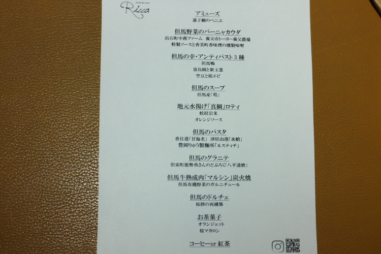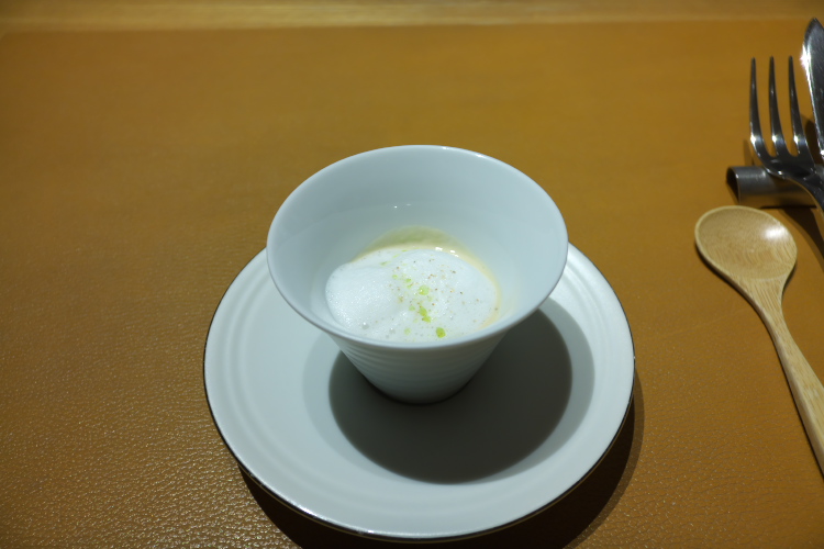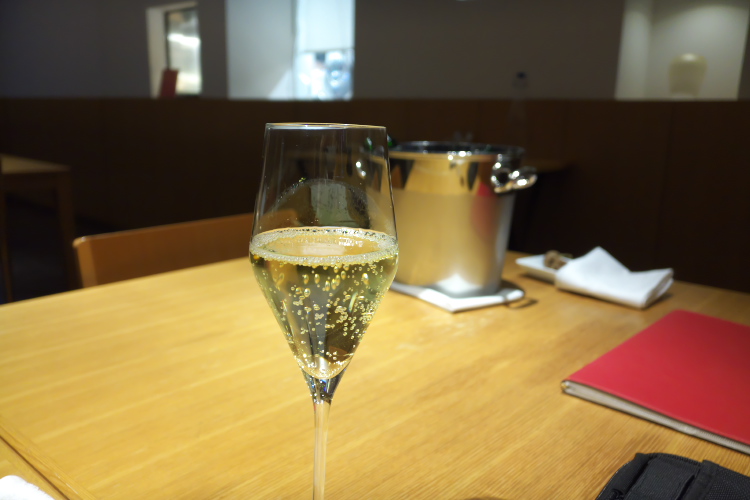 ノンアルコールのスパークリングワインにしました。 ハーフボトルしかなかったので、それで。 お兄さんがコルクを抜いてグラスに注いでくれました。 で、今回のメニューはこちら。