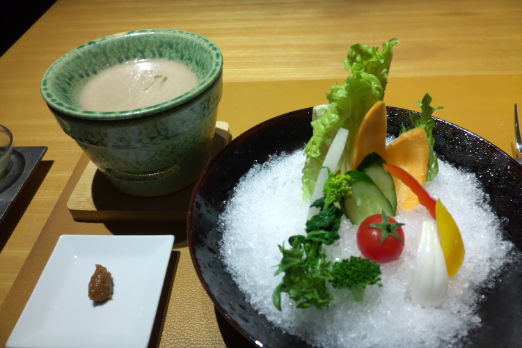 「但馬野菜のバーニャカウダ」 。 いいっすよね、バーニャカウダ。 バーニャをカウダしたものっすよね。 んーと、 これ 。 ピエモンテ語で「バーニャ」は「ソース」、「カウダ」は「熱い」を意味する。 バーニャをカウダしたものっすよね。 翻訳すると、ソースを熱いしたものっすよね。 間違ってはいませんな。 左側の熱いしたソースに但馬野菜を浸してして食べるんっすが、その熱いしたソースが 「出石町中務ファーム 養父市トーヨー秩父農場 特製ソースと香美町香味煙の燻製味噌」 だったりします。 個人的に生野菜って、そんなに好きではないんっすが、ドレッシングが美味しければ美味しく食べられるのと同様、バーニャが美味しいと、イケますな。 で、続いては、
