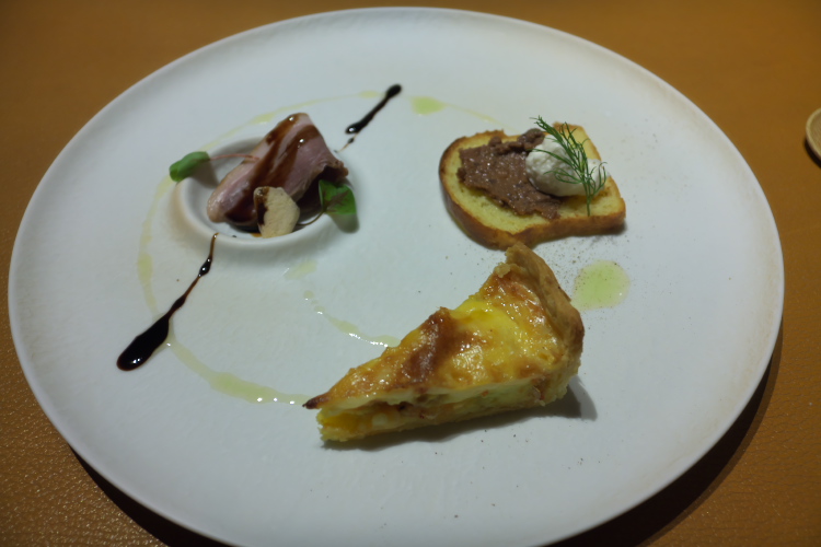 “但馬の幸・アンティパスト3種” 。 その内訳は 「但馬鴨・蛍烏賊と新玉葱・空豆と桜エビ」 。 蛍烏賊は目玉部分がなければ大丈夫だと思っていたんっすが、右上のやつ。 まさかこんな、変わり果てたペースト状の姿で出てくるとは…。 潰される直前、最後の抵抗でスミを吐いた結果、こんなセピア色になっちゃったんっすかね? 原材料が蛍烏賊だと分かっているので、何かキモい…。 で、桜エビは頭とか、殻とか、海老ミソとかがなければ大丈夫だと思っていたんっすが、手前のキッシュみたいなやつの材料になったんっすかね? 原材料が桜エビだと分かっているので、キショい…。 前菜とか、アンティパストとかに珍味系を持ってくるのはやめて頂きたいんっすが、ただ珍しい味というだけで、ちっとも美味じゃねぇし…。 ま、原材料が蛍烏賊とか桜エビだと分からずに食ってしまえば、食って食えないものではないんっすが、個人的には鴨だけでいいカモ? で、続いて、