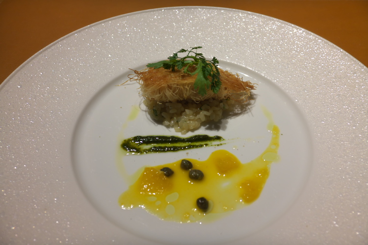 お魚料理。 「地元水揚げ “真鯛” ロティ」 っすか。 疑問点は1つだけ。 真鯛は分かるとして、ロティって、何や? えーと、 ロティとは 。 なるほど。 京風に言うと、「真鯛の焼いたん」 みたいな? ただ焼くのではなく、カダイフ? …を付けて焼いてあって、で、焼かれた真鯛の下には蛇紋岩米が敷いてあったりします。 で、お皿にはオレンジソースが。 基本的に魚料理があまり好きではない僕なんっすが、切り身をこのように洋風に調理したものは、悪くないと思います。 で、続いては