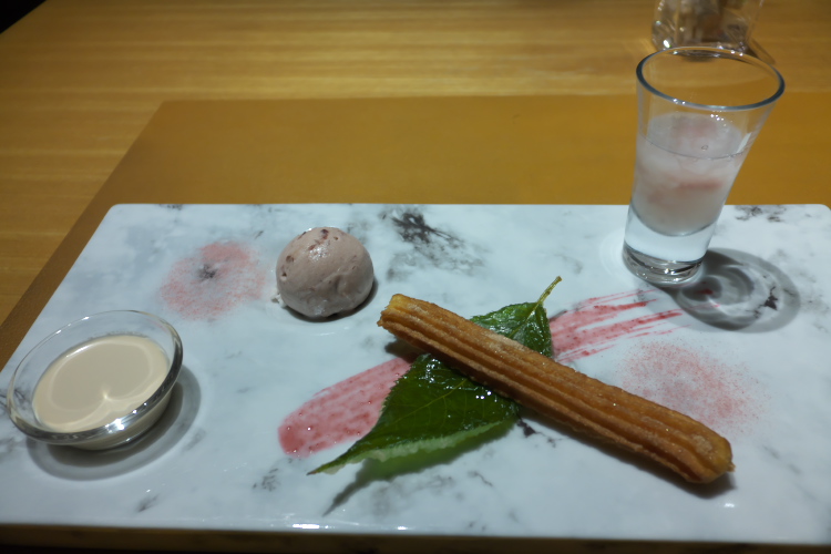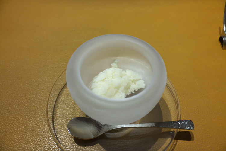 “但馬のグラニテ” 。 コースの途中に、お口直しの “水菓子” が出るのって、贅沢〜。 但東町能勢勇さんのどぶろく 「八平達磨」 を使ったシャーベット。 冷(ちめ)たい。 美味ちい♪ で、お口も直ったところで、いよいよメインの