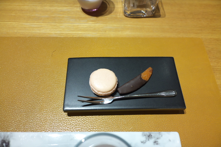 “お茶菓子” と “コーヒー or 紅茶” 。 デザート or ドルチェ or 水菓子の他に、コーヒー or 紅茶用の “お茶菓子” も付くって、何か得した気分で贅沢っすよね。 で、その内訳は 「オランジェット 桜マカロン」 。 個人的にはマカロンよりも、ホカロンのほうが好きなんっすが、いや、使い捨てカイロは食えないんっすが、オランジェットが嬉しい♪ 砂糖漬けのオレンジにビターなチョコレートを絡めたやつ。 美味しいんっすよね、これ♪ んなことで、終わりよければすべてよし。 とっても満足なディナーでありました。