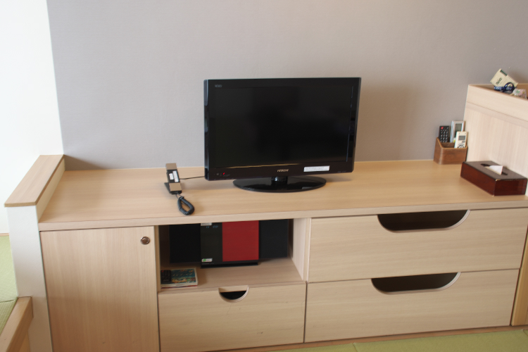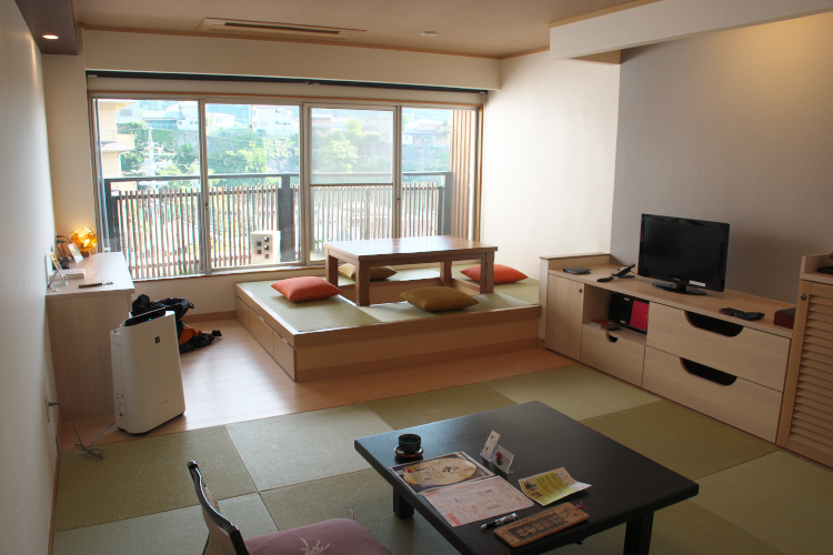 和モダン・腰掛けられる和室 10畳+畳座 っす。 窓際に “腰掛けられる畳座” があるのが特徴なんっすが、一段高くなっていて、座るところが掘りごたつみたいになっていて、斬新♪ ぶっちゃけ、このスペース、個人的にはあまり使い道がなかったんっすが、普通の和室にはしたくない。 その意欲は評価していいのではなかろうかと。 改装したばかりなのか、めっちゃ新しくて、綺麗だし。 で、畳座ではない普通の座卓のほうで、若いお姉さんがお茶を入れたりしてくれたのではなかったかと。 この旅館の従業員、若いお姉さんが多かったっすぜ。 僕の部屋を担当してくれたお姉さんは、ちょっと案内が辿々しかったりしたんっすが、初々しくて、可愛い♪ やまやましい? はつはつしい? …ではなく、辿々(たどたど)しいけど、初々(ういうい)しい。 で、部屋の備品で個人的に嬉しかったのは、
