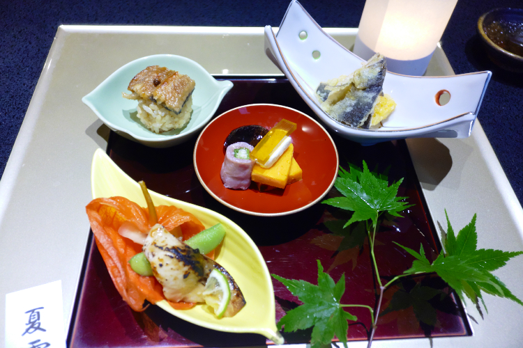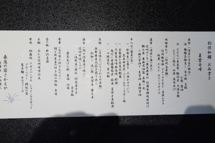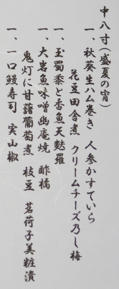 “中八寸” 。 八寸ゴレライ、八寸ゴレライ♪ 懐かしいっすな、8.6秒バズーカー。 (盛夏の宵) らしいんっすが、その内訳はというと、えーい、面倒臭い。 メニューを拡大するので、自分で確認して下さい。 ほれ 。 煮物・焼き物・揚げ物などが、ちょっとずつ。 見た目がお洒落で、いいっすな。 クリームチーズ乃し梅、可愛い♪ で、続いては