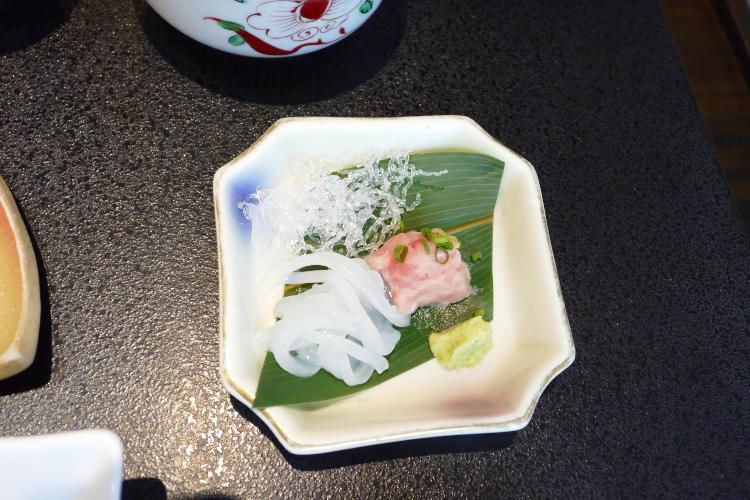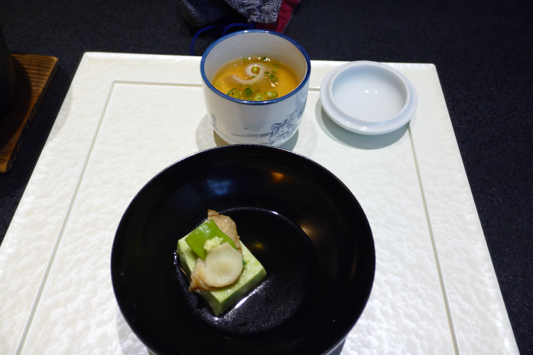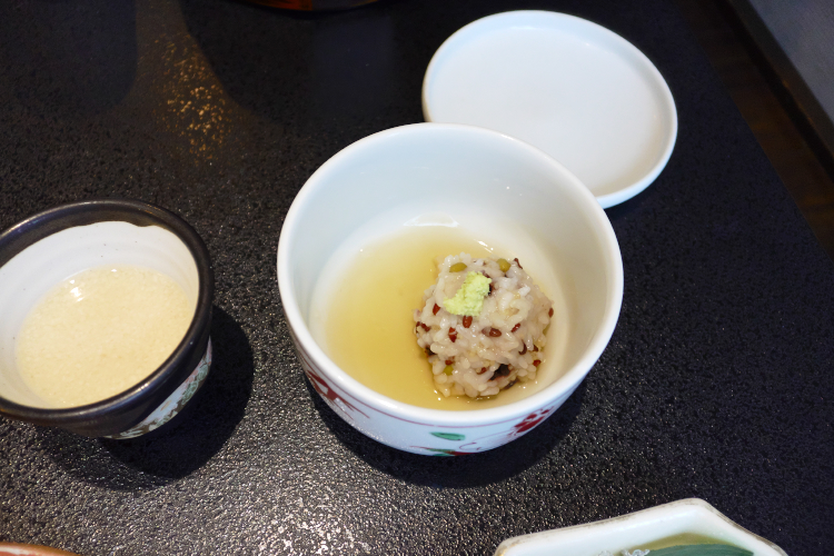“座付” 。 “前菜” などという「ありきたり」なものは出さない。 そんな強い意志が感じられるんっすが、(温菜と冷菜の融合) だそうっす。 で、温かいほうは 「鱶鰭茶碗蒸し 百合根 旨餡 小葱 葱油」。 鱶鰭っすか。 凄ぇぇぇ! 漢字が難し過ぎてよく分からないんっすが、あ、鱶鰭(フカヒレ)っすか。 それは凄ぇ! 和にとらわれない。 中華の高級食材、出すアル。 そんな強い意志が感じられます。 ぶっちゃけ、フカヒレそのものに味はなく、食感を楽しむものだと思うんっすが、お味のほうは旨餡が、旨ぇぇぇ! で、冷たいほうは 「だだちゃ豆豆腐 鮑浅煮 大徳寺麩 もろっこ隠元 山葵 美味出汁」。 だだちゃ豆っちゃ♪ ( ← 可愛い) で、鮑。 個人的にあまり好きではないんっすが、どれが鮑や? …という分量だし、浅く煮てあるので、問題なし。 大徳寺麩。 よく分からんのっすが、所詮は麩なので、問題なし。 もろっこ隠元。 モロッコヨーグル好きな僕にとっては、嬉しい食材でありますな。 で、お味のほうはというと、美味出汁が、美味ぇぇぇ! で、続いては