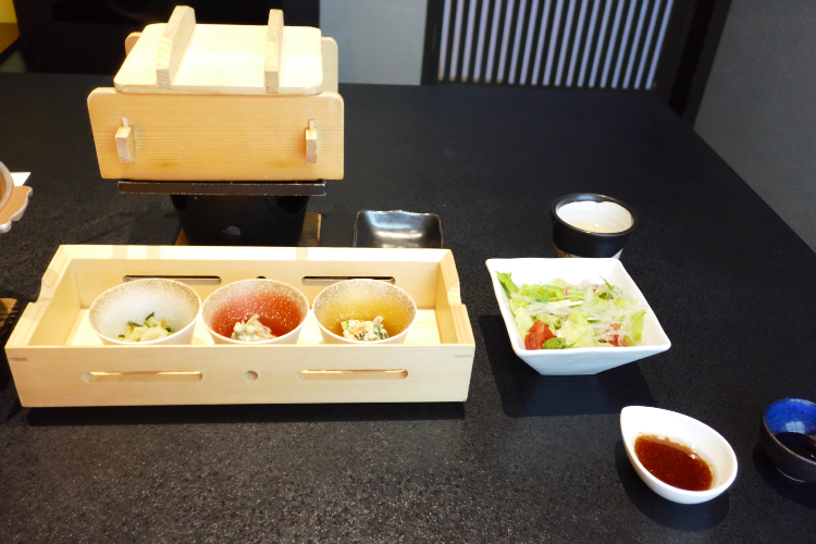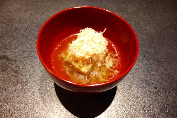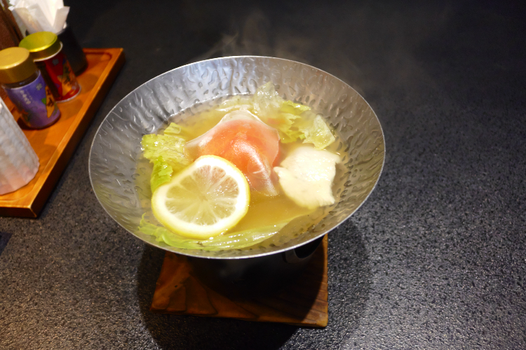 “吸物替わり” 。 “吸物” などという「ありきたり」なものは出さない。 そんな強い意志が感じられるんっすが、「信州高原鍋」っすか。 具材はというと、信州福味鶏・アメーラとまと・高原レタス・板蕨・れもん・オリーブオイル。 高原レタスを使っているのが、いかにも高原鍋っすな。 信州福味鶏が入っているのが信州だし。 アメーラと、レタスと、オリーブオイルは片仮名、とまと、れもんは平仮名。 この拘りは凡人には分かりかねるんっすが、レタスとトマトが入ったレモン味の鍋。 さっぱりしていて、美味ちい♪ で、続いては