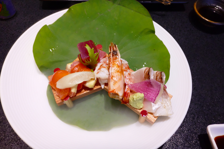 “造里” 。 (清流と海の恵み) っすか。 「山に来たんだから、海の幸は...」 (中略) お客様の声からこれまではありきたりの食材を使った料理だったということに気づきました。 …と言いつつ、御造りがないと、「この旅館は刺身も出さんのか!?」 と、年寄りから文句を言われるんでしょうな。 僕は基本、魚介類の類いが苦手なんっすが、刺身や寿司は好きなので、文句を言いたくなる気持ち、分からんではありません。 で、内訳は 「信州サーモン無花果重ね 信濃雪鱒焼目付け 鮪小角 車海老油霜」 。 信州サーモンと信濃雪鱒(シナノユキマス)、ちゃんと地元食材の “清流の恵み” が入っているのがいいっすな。 後者の実態は コレゴヌス・マレーナ らしいんっすけど。 生醤油と香梅醤油、二種の醤油で “味変” できるのもいいし、どれも新鮮で、美味ちい♪ で、続いては