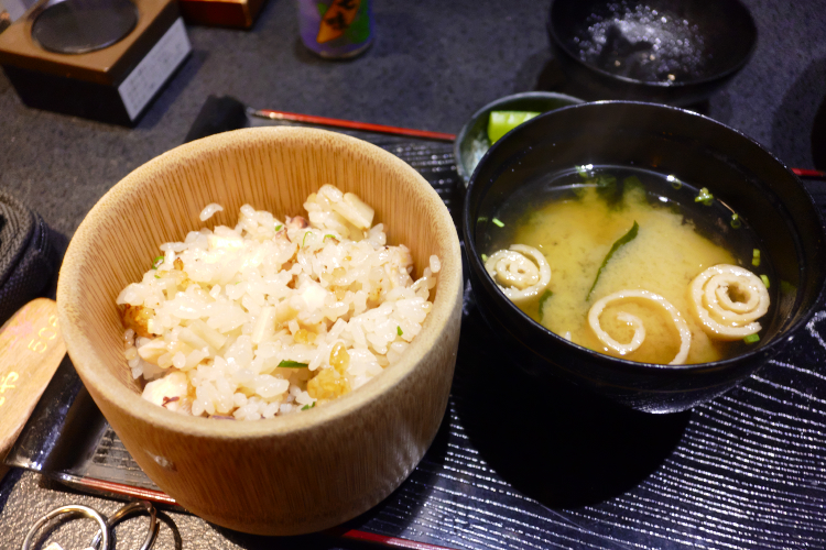 “食事” (旬の味を炊きたてで)。 その旬は 「蛸と新生姜の炊き込み御飯」 。 シュン…と、しょげるほどの事ではないんっすが、蛸かぁ…。 信州っぽくはないっすよね。 ま、蛸もイイダコの頭とかでなければ嫌いではないし、新生姜のほうが、新生姜 → しんしょうが → しんしゅうが → 信州が。 信州っぽいいので、別にいいんっすけど。 食べてみたら、蛸、普通に美味しかったし。 で、締めの