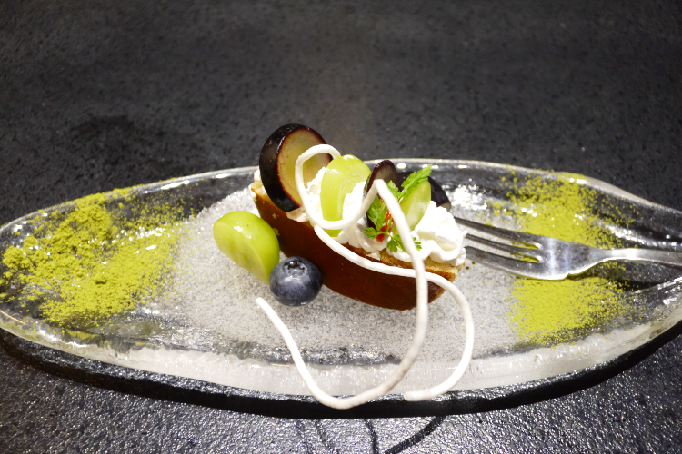 “甘味” は 「銅鑼焼 ナガノパープル シャインマスカット ブルーベリー 枸杞の実 葛素麺 セルフィーユ」 。 盛り付けが可愛い♪ この白い紐みたいなのが葛素麺なんっすかね? 特に味は無かったんっすが、お飾り要員なので、それで十分かと。 んなことで、以上、「ありきたり」でない、和にとらわれない創作料理で、よかったな♪ …と。