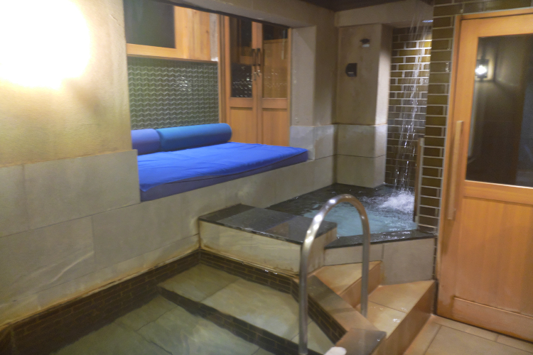 で、「森の癒し」。 右下に見えているのが源泉かけながし温泉。 この写真だと分かりにくいんっすが、広々としています。 普通の宿なら、こういう貸切風呂を45分くらい借りられるだけだったりしますよね。 が、ここは違います。 真ん中辺りに見えているのが水風呂。 上のほうからザンザンと、滝のように冷たい水が降ってきます。 ヒィ〜〜〜〜♪ で、右奥の扉がサウナ。 2人余裕で入れる大きさだったかと。 青いマットのところがゴロンと寝転べるスペースになっていて、さらにそこから外に出て、デッキチェアみたいなので外気浴することも出来ます。 完璧! 浴室の手前には洗面台と脱衣所があって、そこには