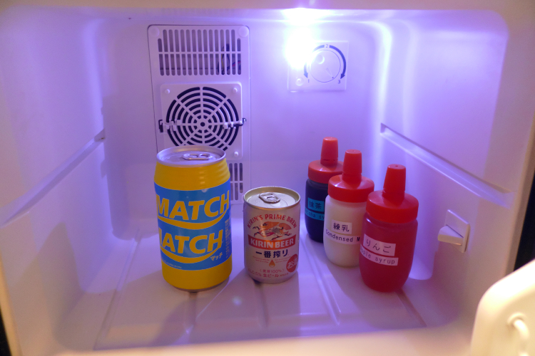 冷蔵庫が。 中には小さなビールと「MATCH」が入っていて、どちらも無料♪ 更には業務用の製氷機もあって、中には氷がたっぷり♪ この氷は飲み物に入れてもいいし、水風呂に投入してキンキンに冷やしてもいいし、